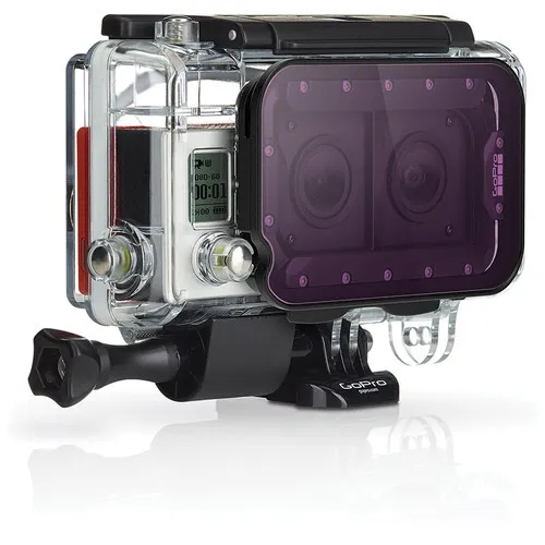 The Magenta Dive Filter for Dual Hero System from GoPro is a colour correction filter designed to remove green colour cast while using the cameras in green waters and is ideal for freshwater lakes and reservoirs or salt water that appears green due to algae content. It works best when used at depths between 15 and 70'. The filter is specifically for the Dual HERO system, a special housing that holds two HERO3+ Black Edition cameras for 3D video and photography.