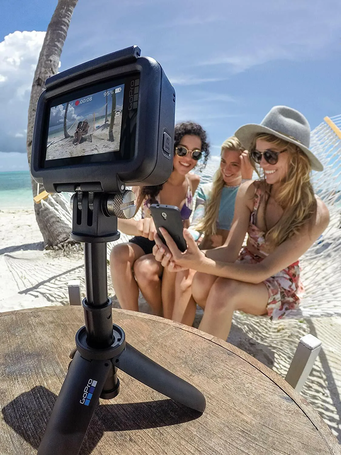 - Prop shorty up on any level surface with its built-in tripod