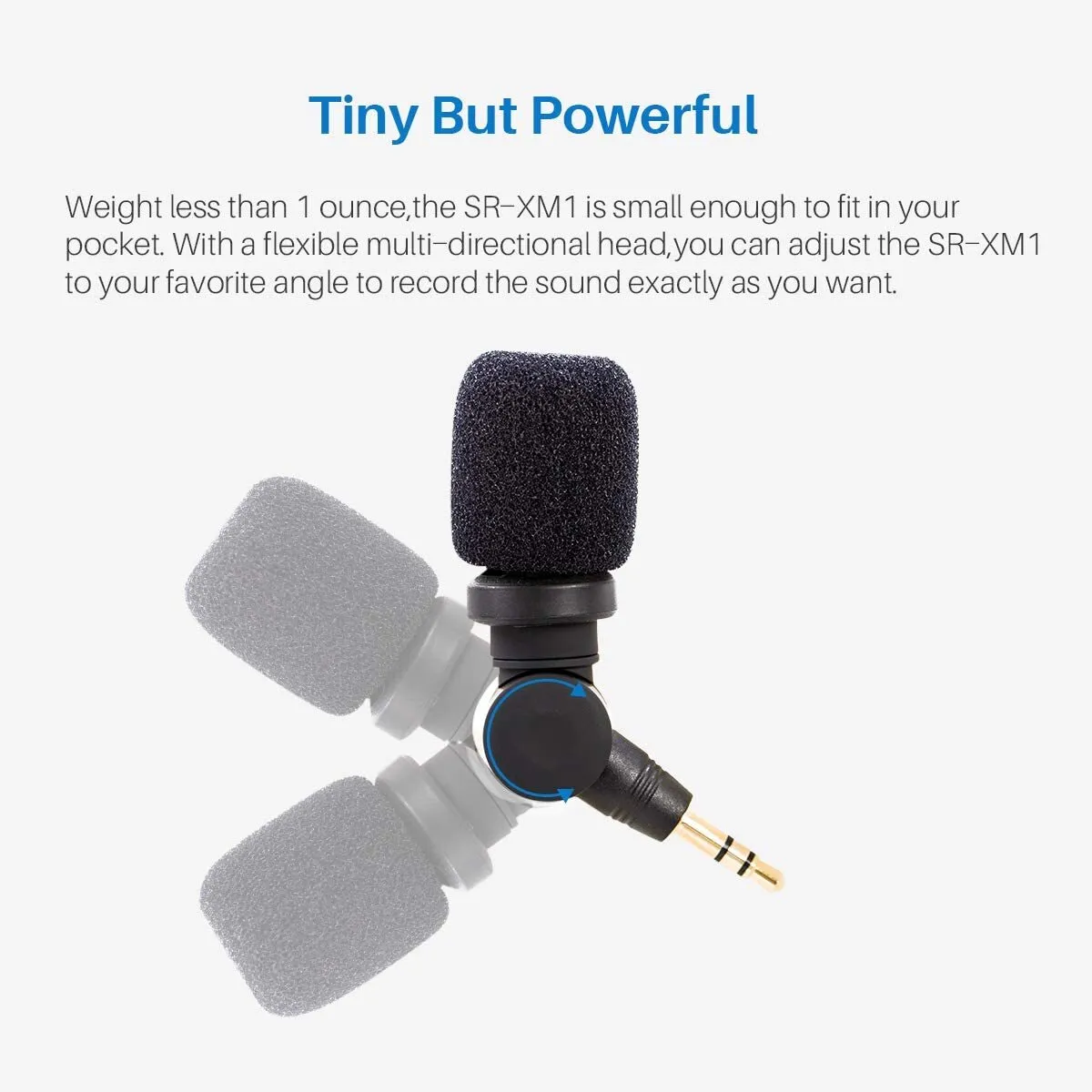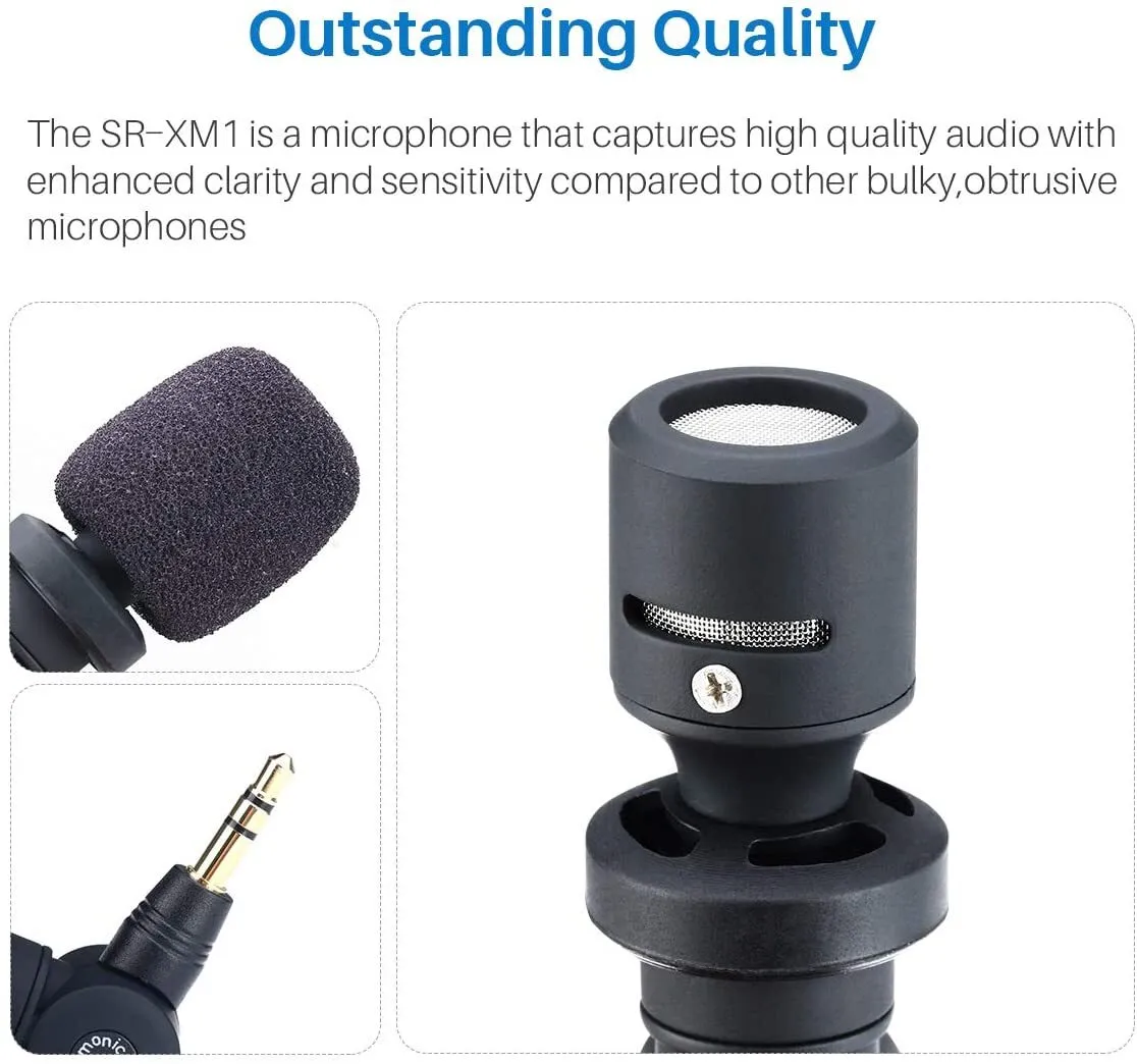 The SR-XM1 is an electret condenser mic that needs no battery and can plug directly into your recorder, mixer, or portable device. It weighs less than 1 ounce and is small and light enough to fit in your shirt pocket. Featuring a flexible, multidirectional head, the SR-XM1 is suitable for musicians, journalists, or any spot recording. A foam windscreen is also included.