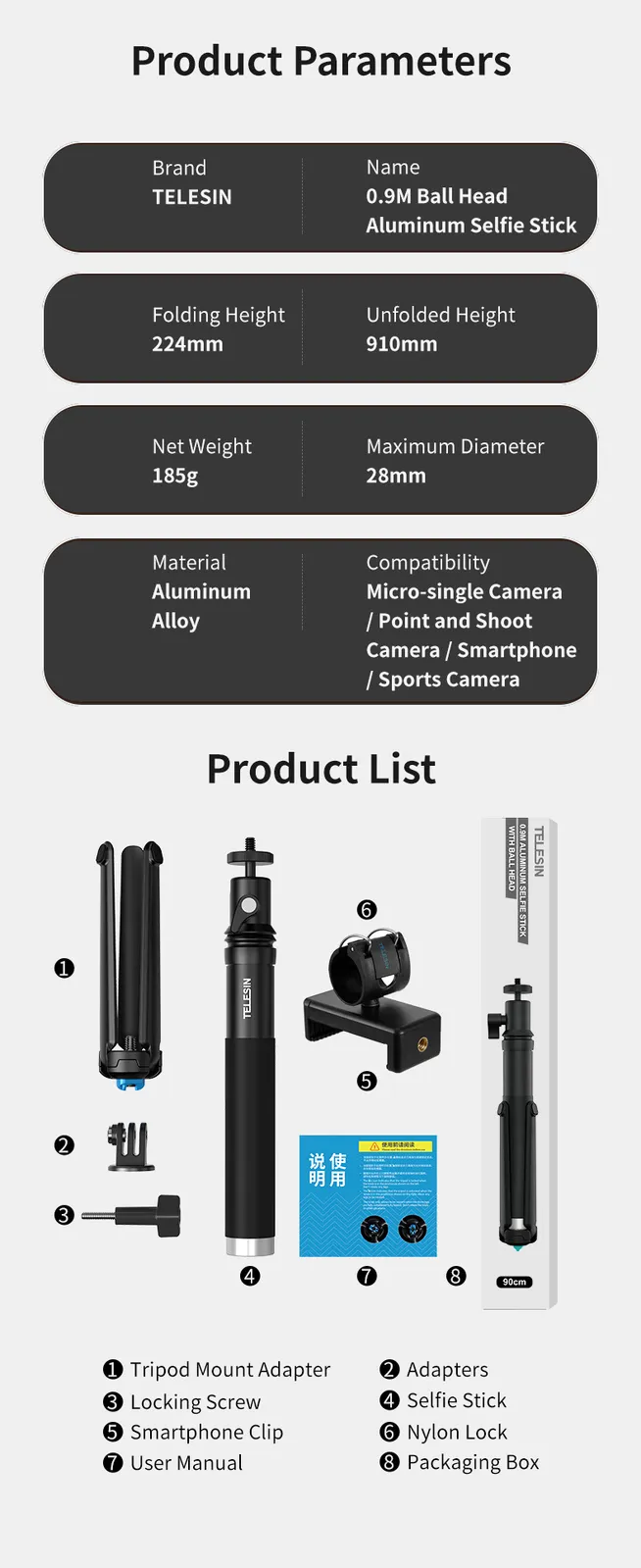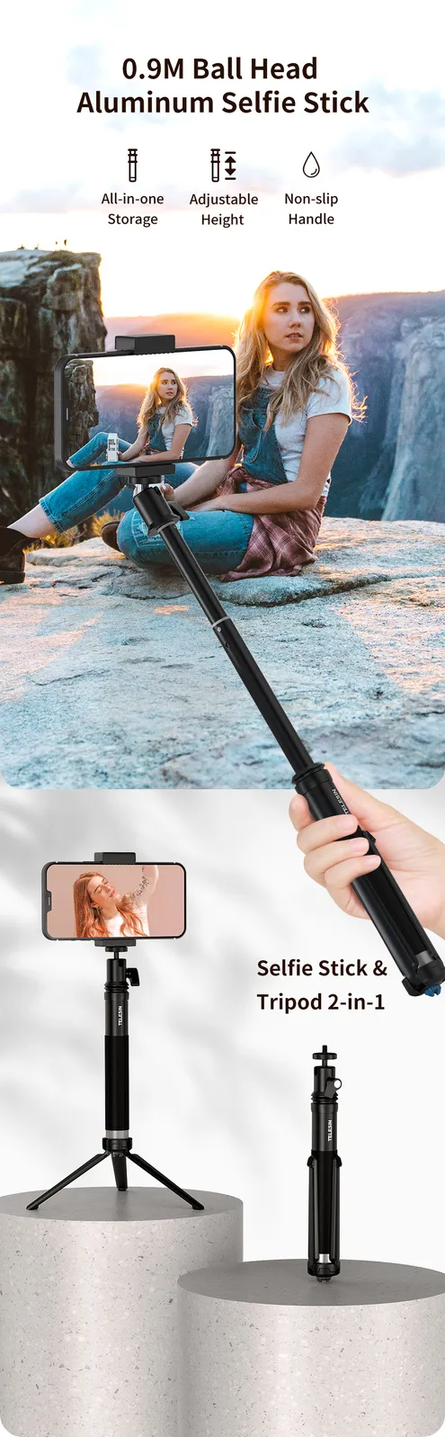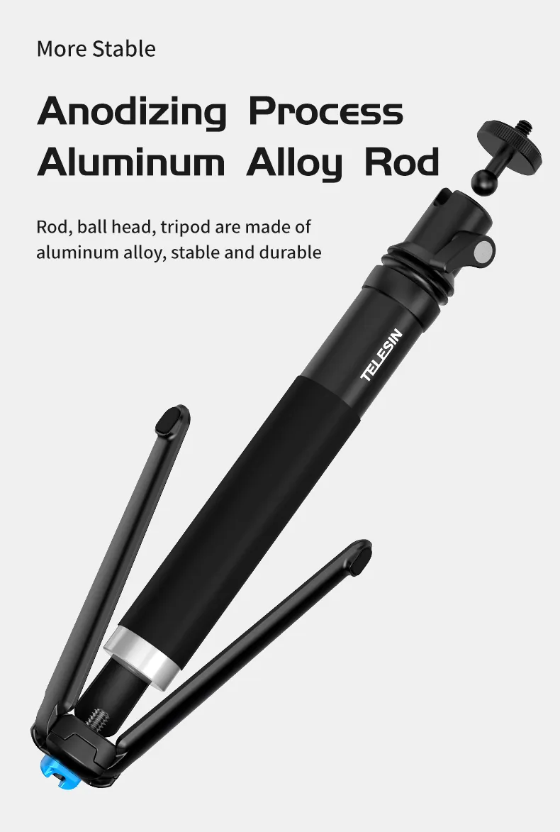 Telesin 90cm (0.9m) Aluminium Selfie Stick with Tripod Base + Ballhead