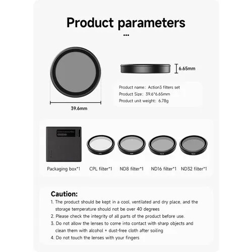 Telesin Circular Polariser and ND Filter Set for DJI Osmo Action3 / DJI Action4 / DJI Action5 Pro Cameras (CPL / ND8 / ND16 / ND32)