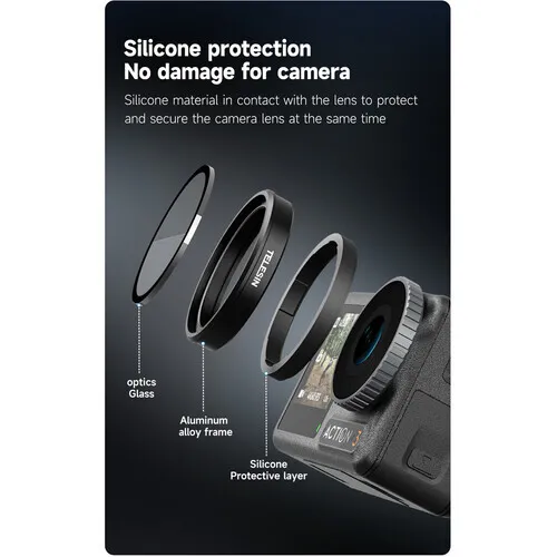 Reduce exposure to cut down superfluous and undesirable light and eliminate reflections to emphasise the image contrast captured by your DJI Osmo Action3, Action4 or Action5 Pro camera with this Circular Polariser and ND Filter Set from TELESIN. The kit comes with three neutral density filters (ND8, ND16, and ND32) and a Circular polariser (CPL) filter for enhancing the saturation of your image. Encased in a sturdy aluminium alloy frame, the filters are very easy to mount as they simply screw on gently onto your camera lens. A protective silicone layer ensures secure mounting for each lens while minimising any potential damage.