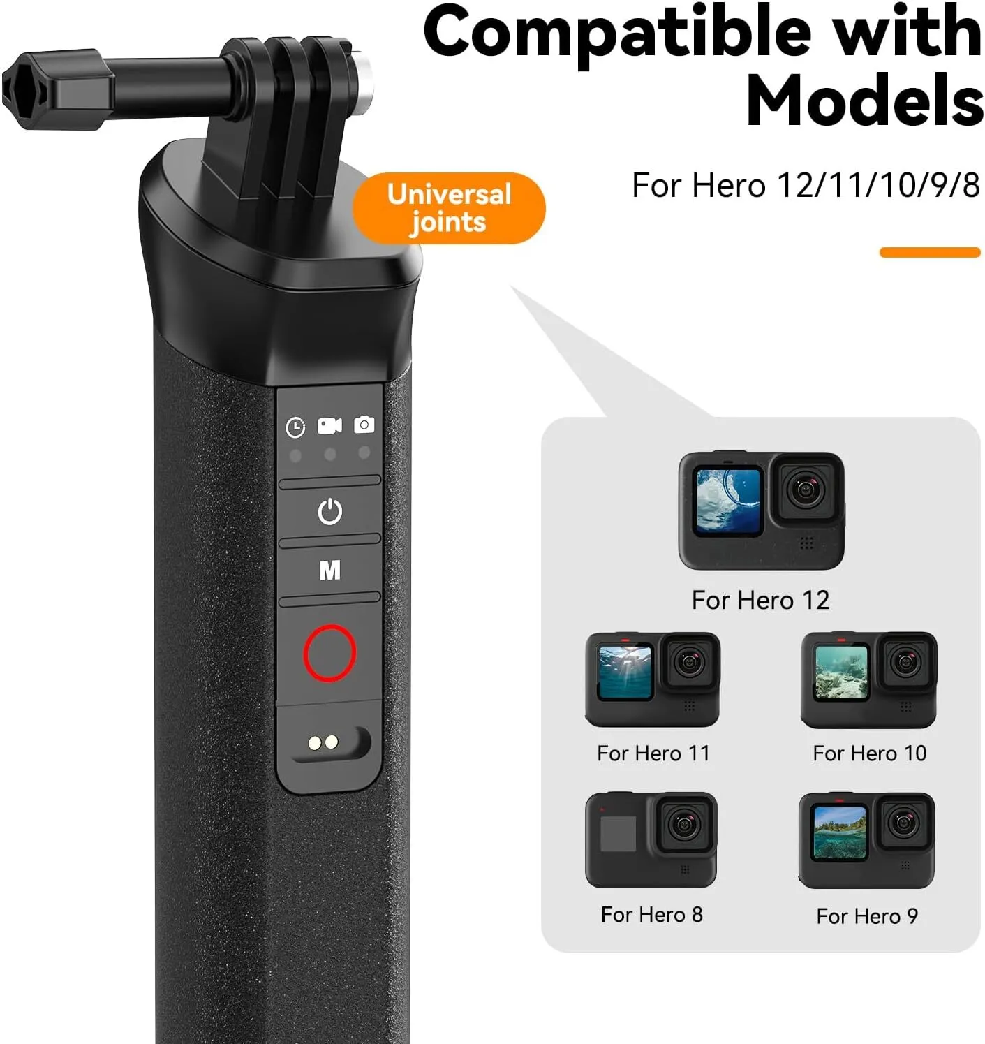It has a built-in Bluetooth remote control compatible with GoPro HERO13, GoPro HERO12, GoPro HERO11 Black, GoPro HERO10, GoPro HERO9 and GoPro HERO8 that allows you to easily start/stop recording, take photos, switch modes, and power your camera on or off, above and below water. NOTE: The remote will work and is waterproof down to 15m but the camera itself is only waterproof down to 10m without an additional protective housing.