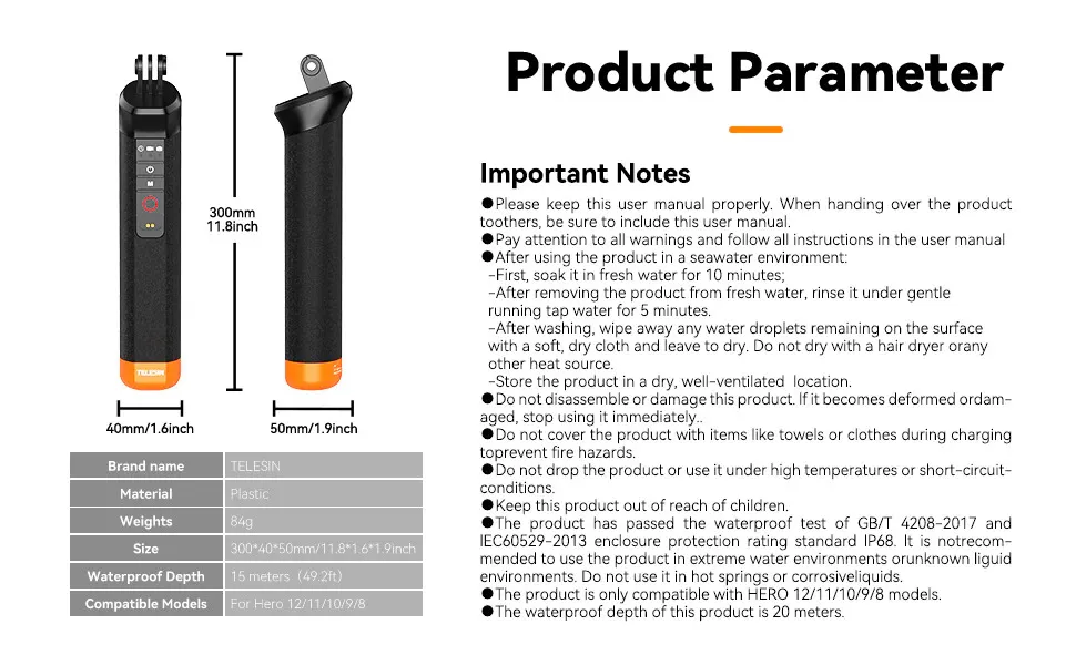 NOTE: The Hand Grip and remote (especially the remote charging terminals) needs to be thoroughly cleaned in Fresh Water after use in salt water. Please read and follow the care instructions.