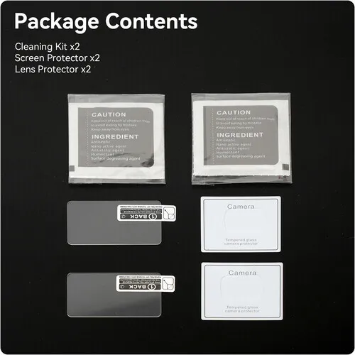 Package Content: 2 x Lens protectors, 2 x Screen protectors, 2 x Cleaning Kits, Instructions.