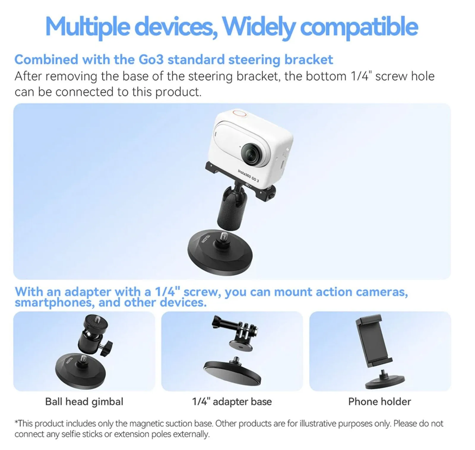 Depending on your intended use, you may need to add additional mounts (NOT INCLUDED) onto the 1/4" Thread on the base, such as a GoPro tripod adapter, 360 Ball head mount, or a smartphone holder.