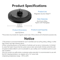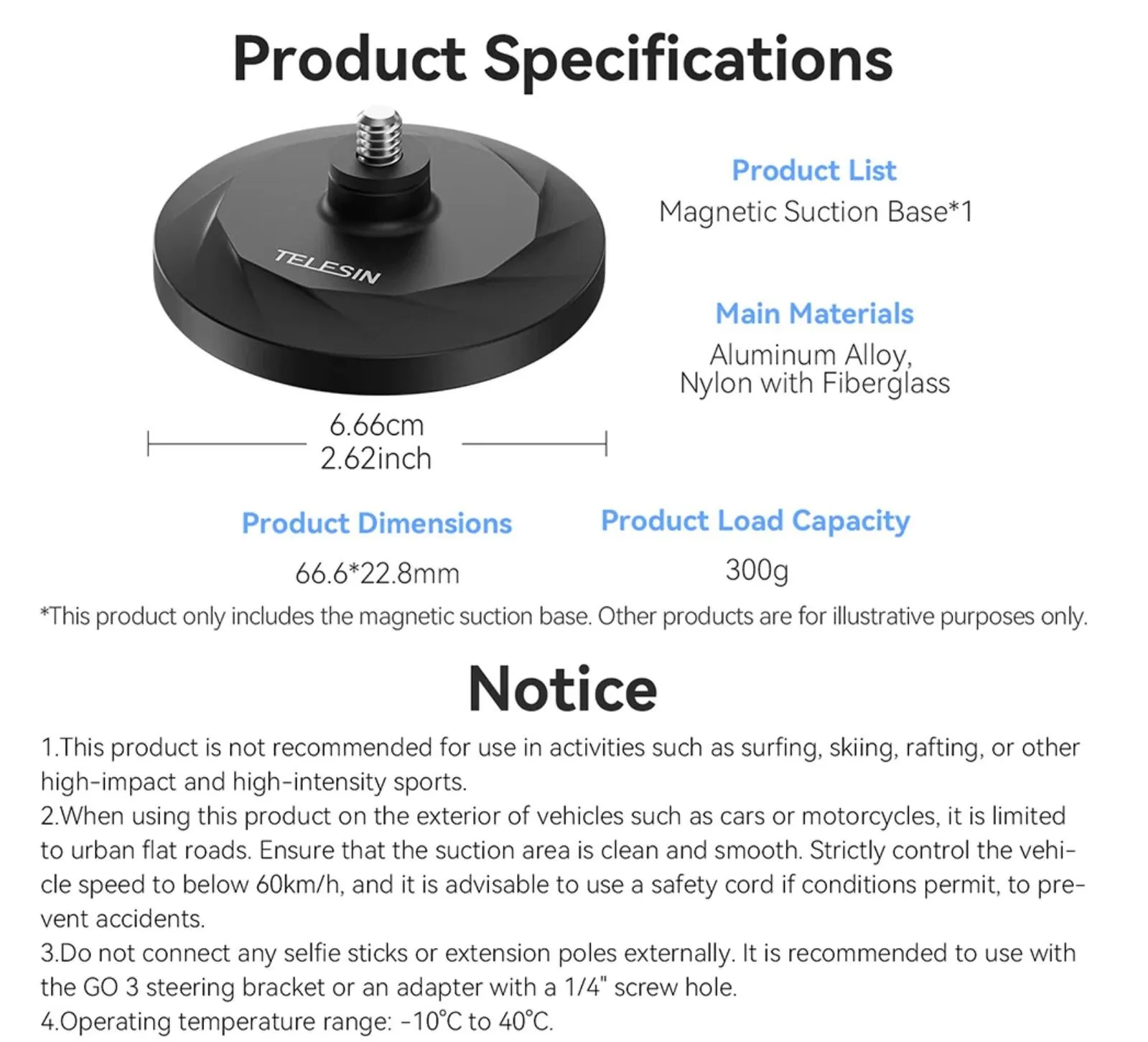 The Telesin Magnetic Base mount allows you to securely mount a variety of cameras and smartphones to metal objects. The magnetic base is quite strong when attached to metal surfaces such as car panels, signs, railings, door frames, filing cabinets, fridges, metal tables, etc.