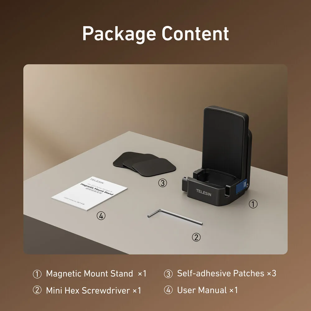- Includes: 1 x Magnetic Mount Stand, 3 x Adhesive metal plates, 1 x Hex Key, 1 x user manual