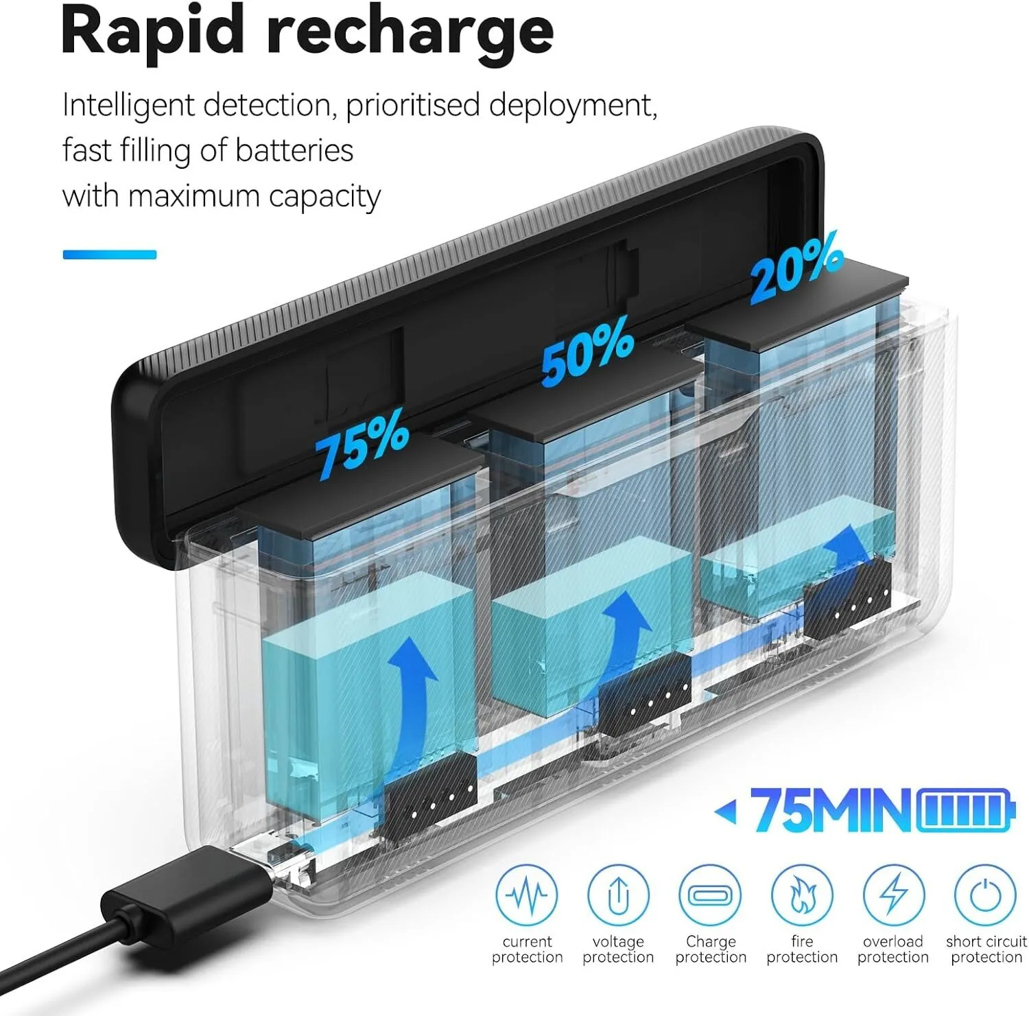 - When using 12V 2A, it can fully charge the 3 batteries within 95 minutes.