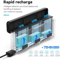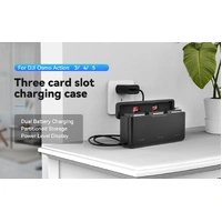 It comes with a Type-C charging cable with a convenient side Type-C input port on the case. The Type-C input supports 5V 3A/9V 3A/12V 2A (fast charging recommended voltage). A FAST charger up to 12V 2A (NOT included) will provide the fastest results. PD3.0 fast charging protocol enables fast battery charging for DJI Action Batteries. A single battery only takes 38 minutes to charge to 80%, and fully charges in 70 minutes. Three batteries can be fully charged in 95 minutes.