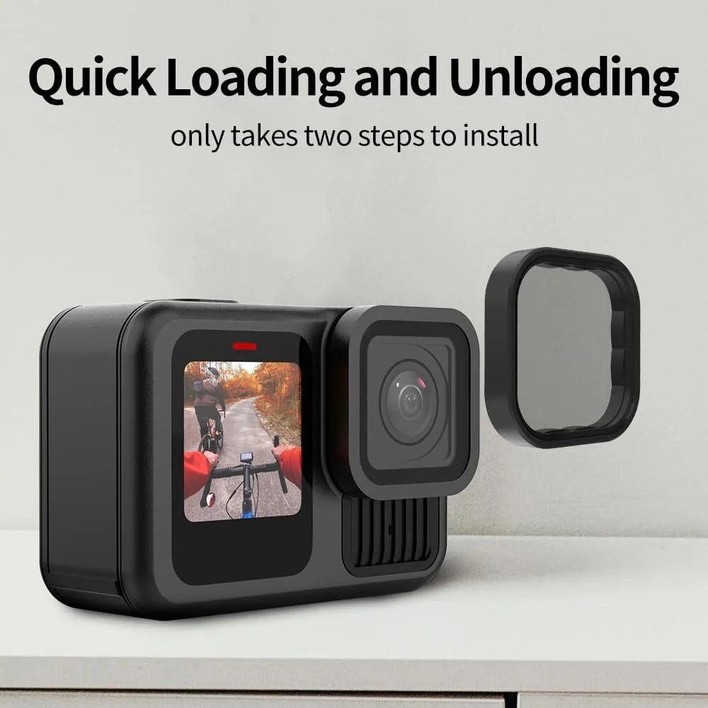 This TELESIN ND Filter 3-Pack is compatible with GoPro HERO13 cameras. It includes three neutral density filters that decrease the amount of light hitting the camera's sensor by varying f-stop increments. This allows you more flexibility with exposure times to create special effects with the movement of light and water without the risk of overexposing the footage. Each filter is constructed with multicoated optical glass that provides water, oil, and scratch resistance while increasing colour saturation.