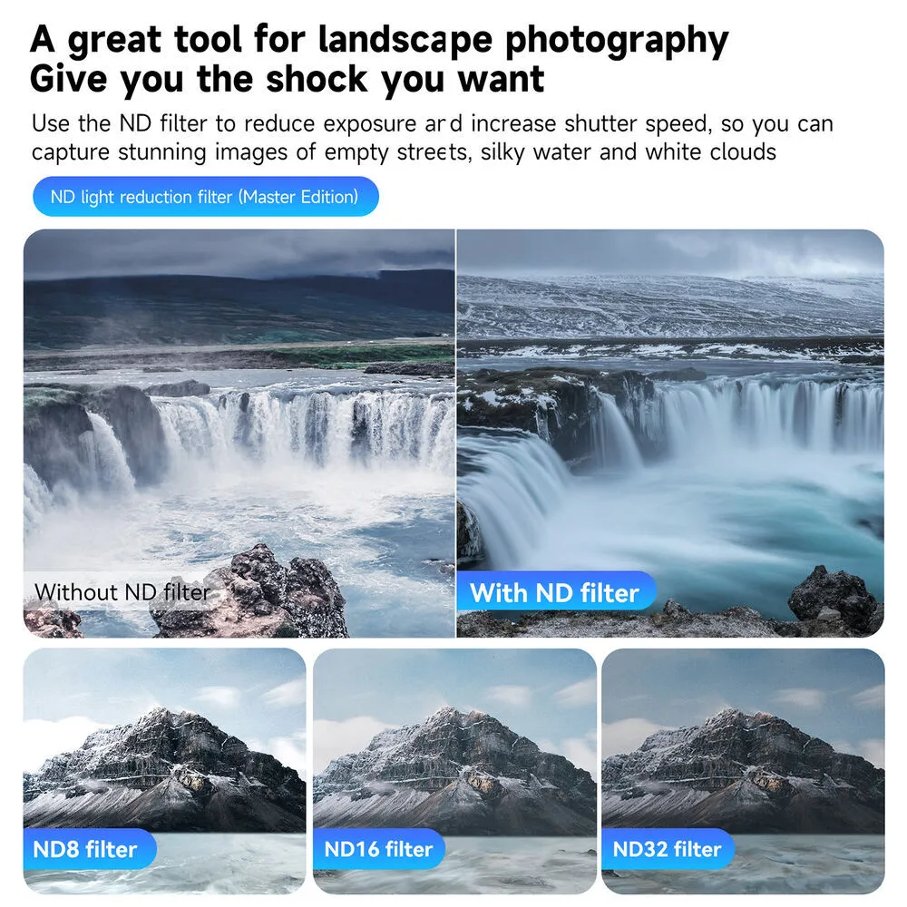 - ND32 reduces light by 5 f-stops