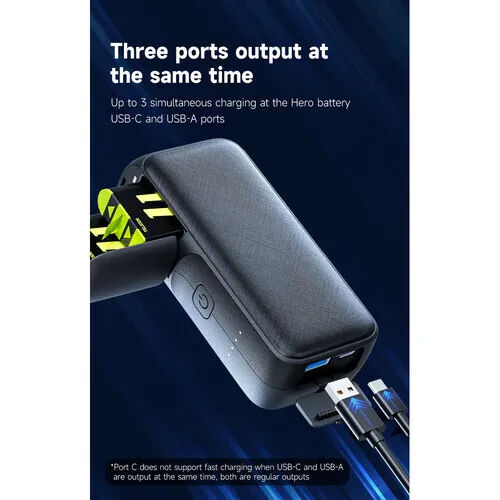 - GoPro HERO battery terminal, USB-C, and USB-A can charge at the same time. NOTE: When USB-C and USB-A are output at the same time, the USB-C port will not support fast charging, and both will perform as regular outputs.