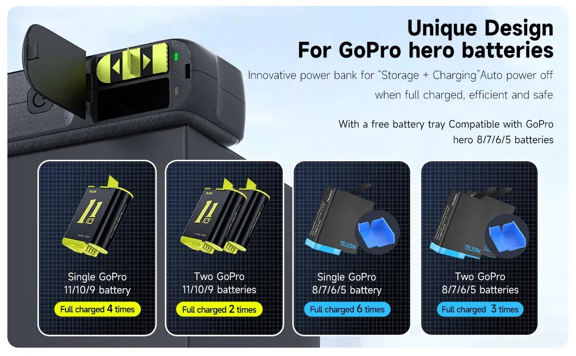 Keep your GoPro HERO batteries always charged and with you in the Telesin Power bank.