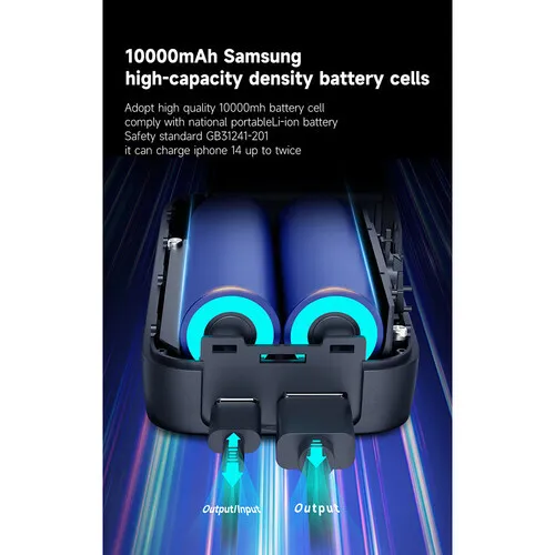 - 10,000mAh Capacity Power Bank. Using high-quality 10000mAh batteries, in line with the portable lithium battery GB31241-2014 Safety standard (China).