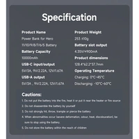 - USB-C input/output: 5V/3A, 9V/2.22A, 12V/1.67A.