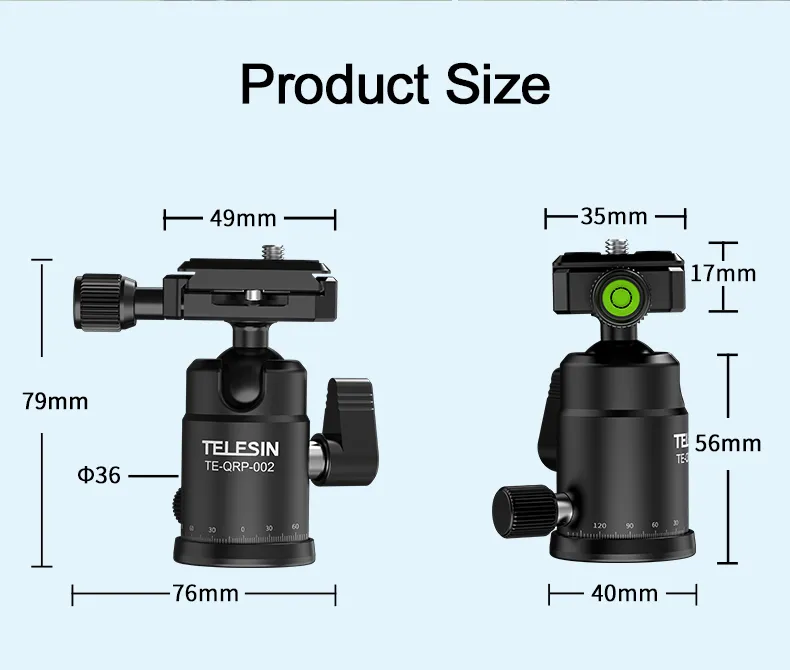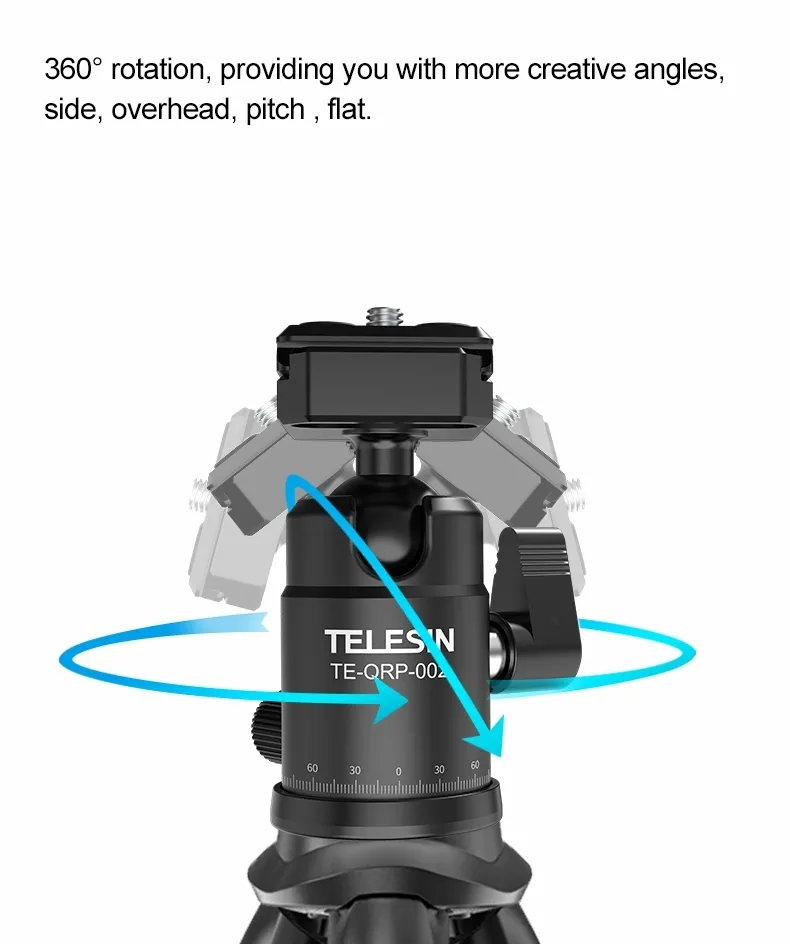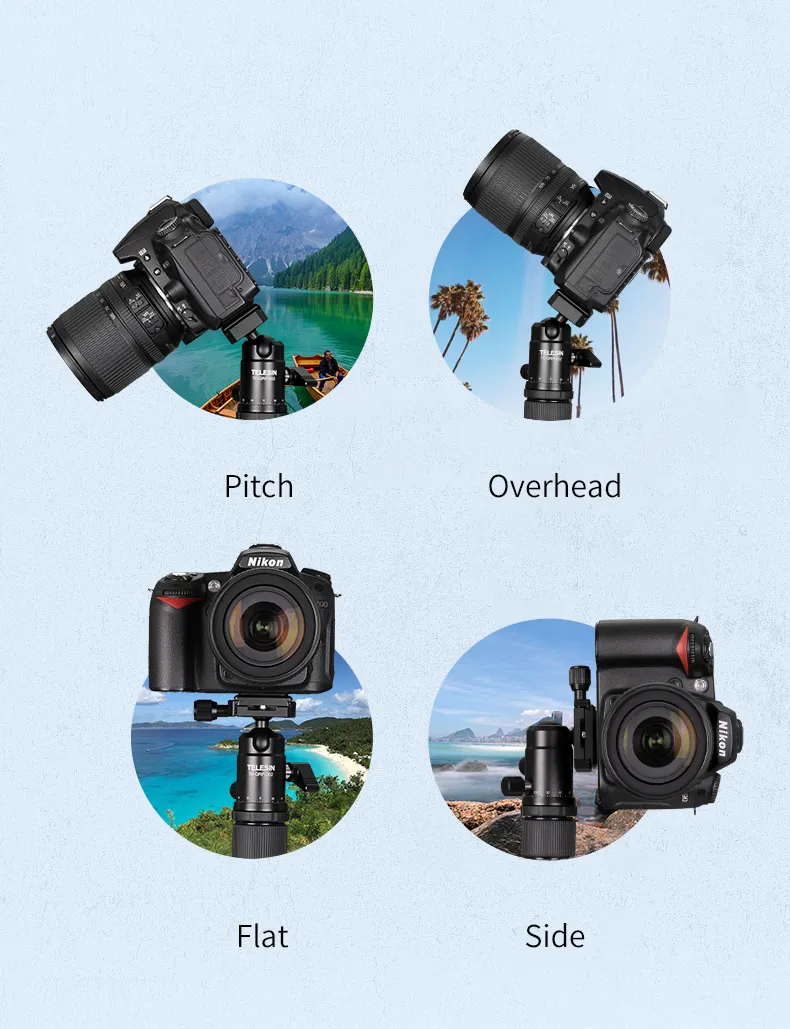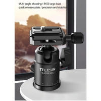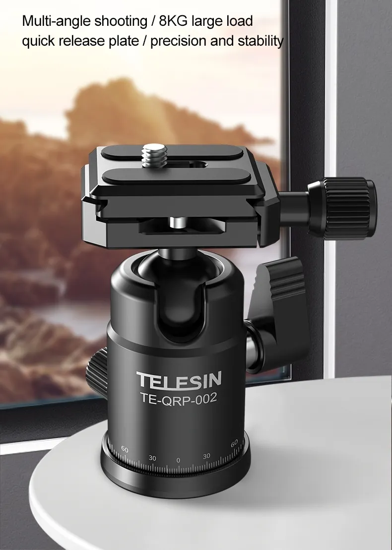 The Telesin Quick Release Plate Ball Head allows 360° pan adjustment at the base and tilt and swivel adjustment via the ball head. You can set up your camera horizontally, or tilt the ball head down 90° to position the camera vertically. The ball head features a 3/8"-16 mounting thread on the bottom with anti-twist slots that you can make use of.