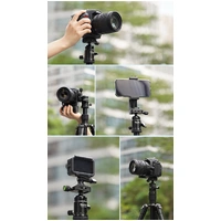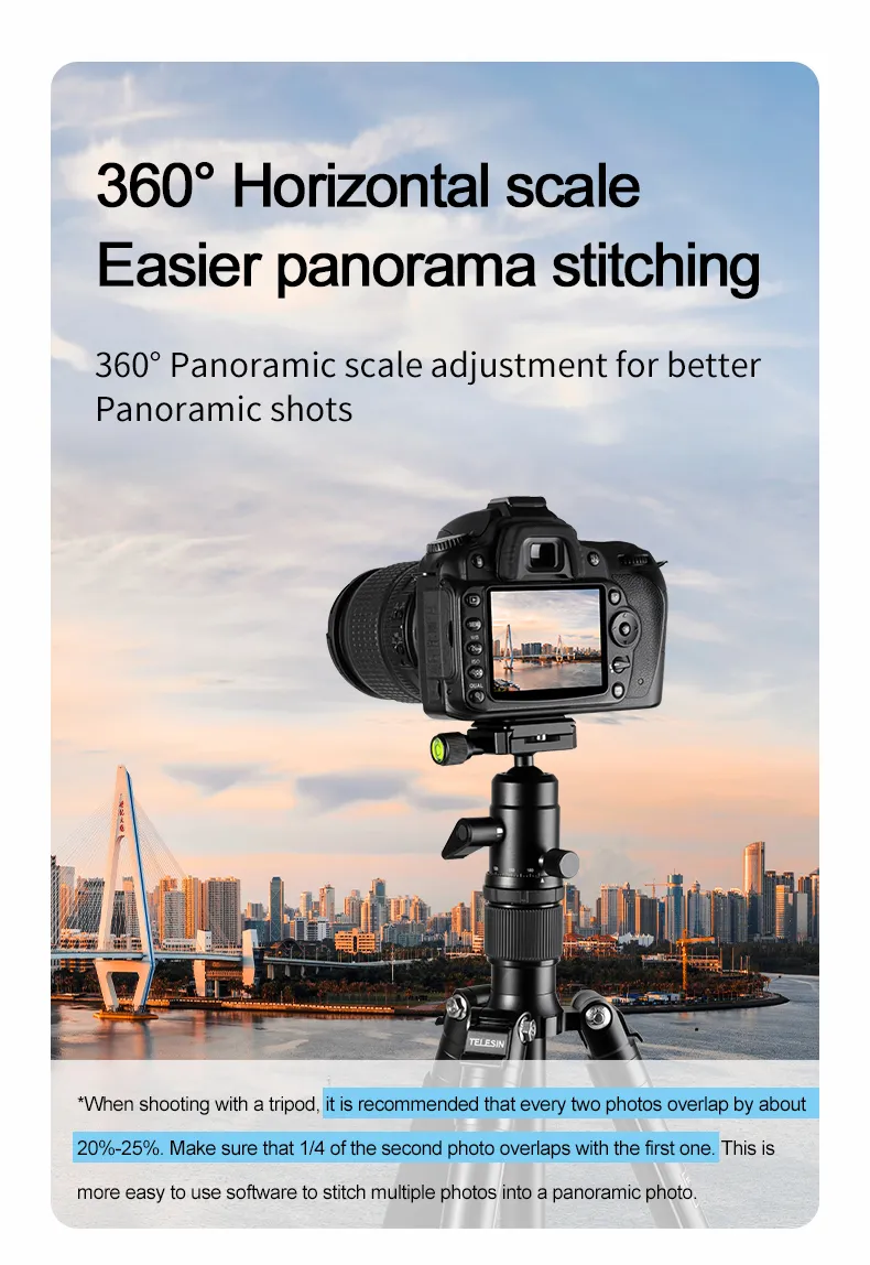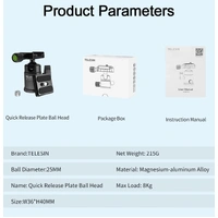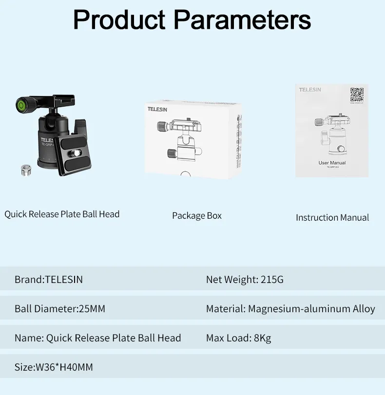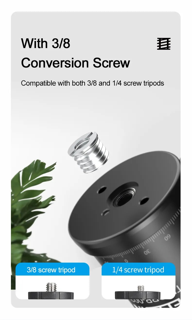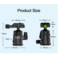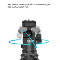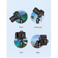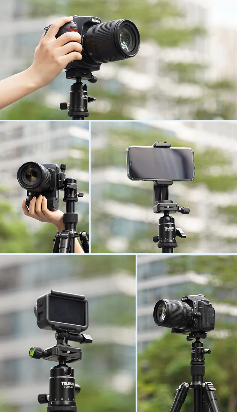 The Telesin Quick Release Plate Ball Head allows 360° pan adjustment at the base and tilt and swivel adjustment via the ball head. You can set up your camera horizontally, or tilt the ball head down 90° to position the camera vertically. The ball head features a 3/8"-16 mounting thread on the bottom with anti-twist slots that you can make use of.