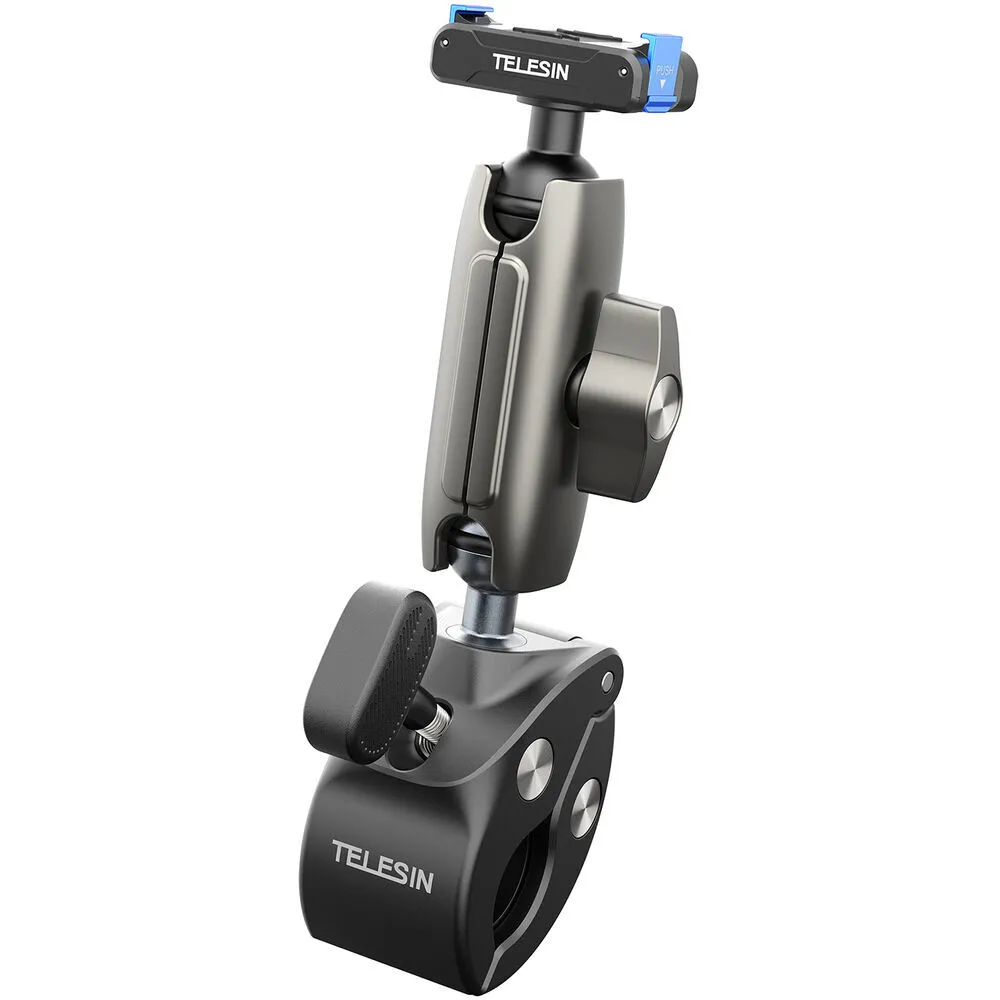 Secure your DJI Action3, DJI Action4, DJI Action5 Pro or DJI Osmo 360 camera to Tubes and Handlebars with this Tube Clamp with Magnetic Quick Release Mount from TELESIN. The Clamp is designed primarily as a Handlebar Mount for Cycling or Motorbikes, but can also be attached to Poles, Branches and more for a wider range of purposes.