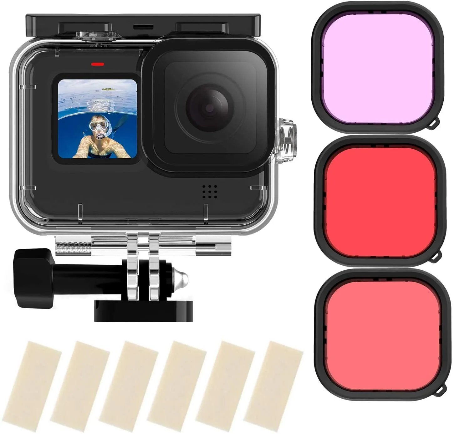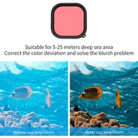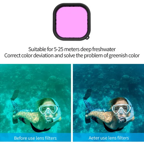 Capture truer colour under the waves with the Waterproof Housing and Diving Filter Set for GoPro HERO13 / GoPro HERO12 / GoPro HERO11 Black / GoPro HERO10 / GoPro HERO9 from TELESIN. This blue/green colour correction set includes a pink filter for snorkelling depths, a red filter for deep-sea water, and a purple filter for freshwater locations.