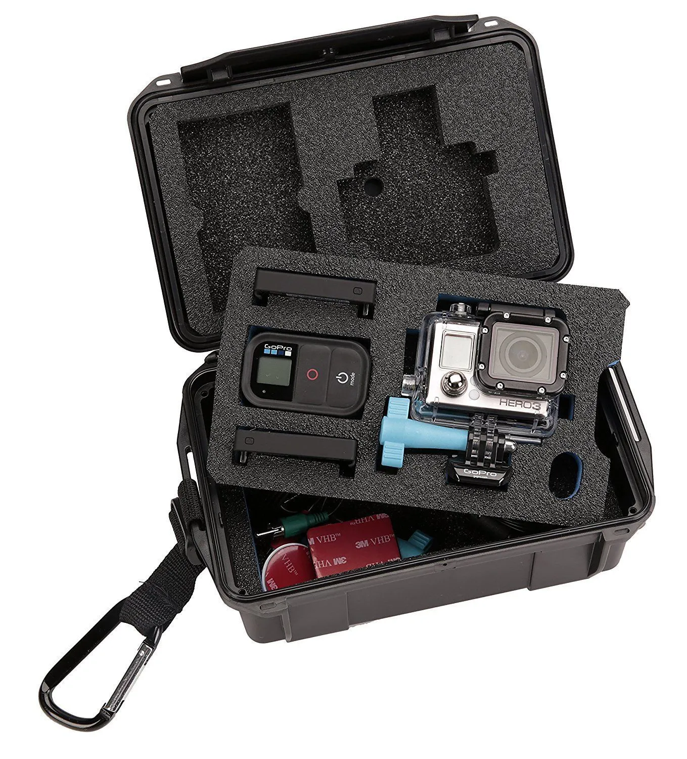 The custom-cut foam stores contents in an organised upper and lower tray system. The upper compartment fits your camera, camera housing, BacPacs and Wi-Fi remote.