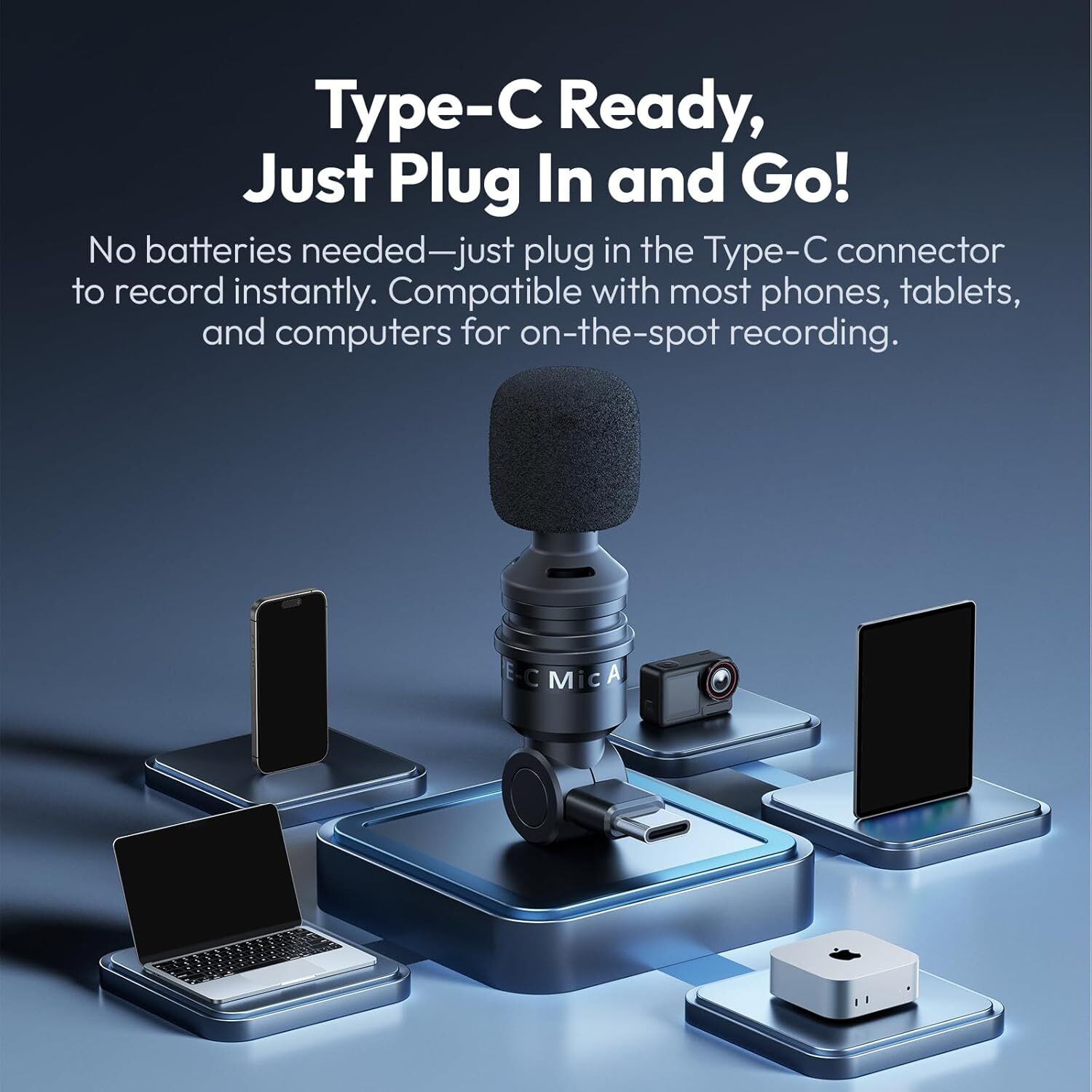 - Type-C Ready: Just plug in the Type-C connector to record instantly. No batteries needed. Compatible with most phones, tablets, and computers with Type-C inputs for on-the-spot recording.