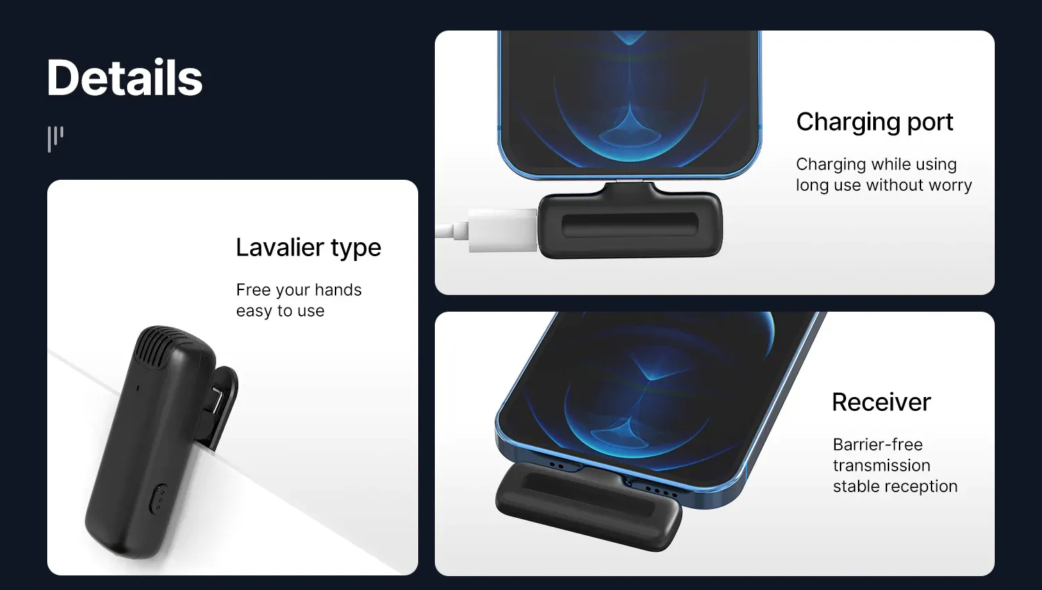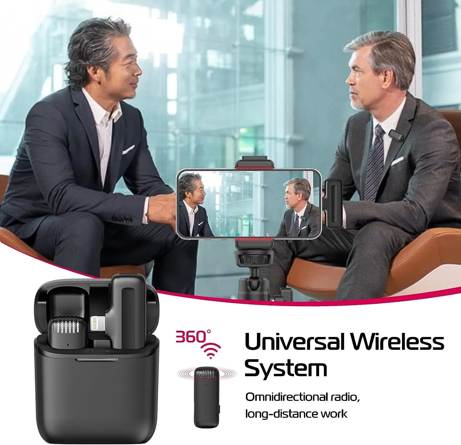 - Sharp Audio at Distance: Using wireless communication between the radio mic and the receiver to realise long-distance recording. The longest transmission distance is up to 20 meters/65ft. Also supports dual-microphone simultaneous recording, which is more widely used