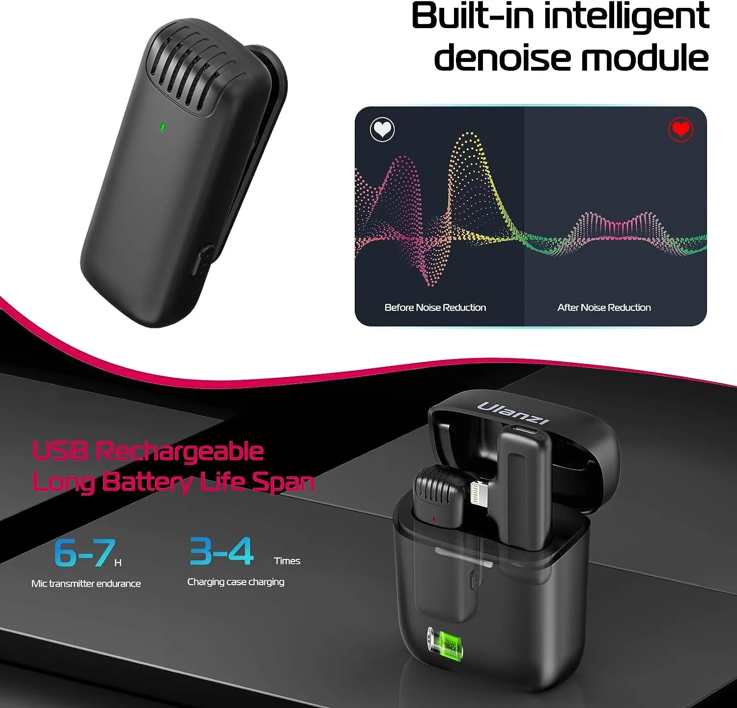 - Plug and Play Wireless Microphone: Just clip the ULANZI wireless microphone to your collar/clothes, plug the Lightning receiver into your device, and they'll connect automatically. No APP is needed.