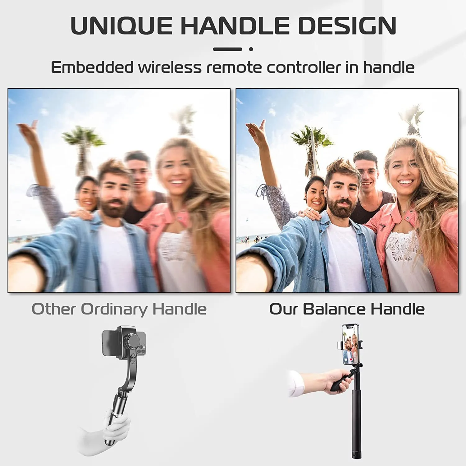 There's a built-in Wireless Bluetooth Remote Shutter in the handle. The shutter has a built-in 55mAh lithium battery, which can be instantly connected and operated easily. The range of the wireless connection can be up to 33ft.