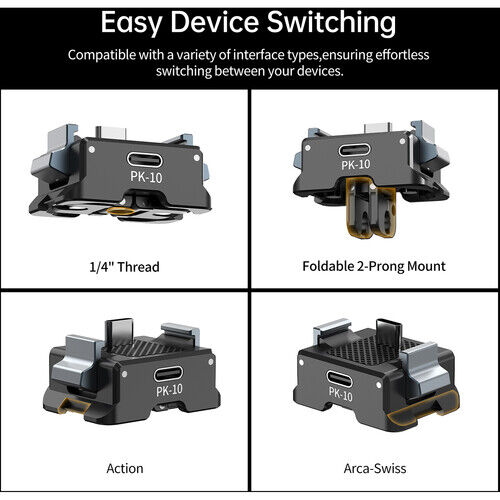 It ensures quick switching between devices using a variety of Mounting systems. There is a 1/4"-20 thread hole in the base for mounting on any standard 1/4"-20 tripods and Mounts. There are also flip-down GoPro-style fingers that allow for mounting on Action Camera mounts that utilise the GoPro 2-Prong mounting system.