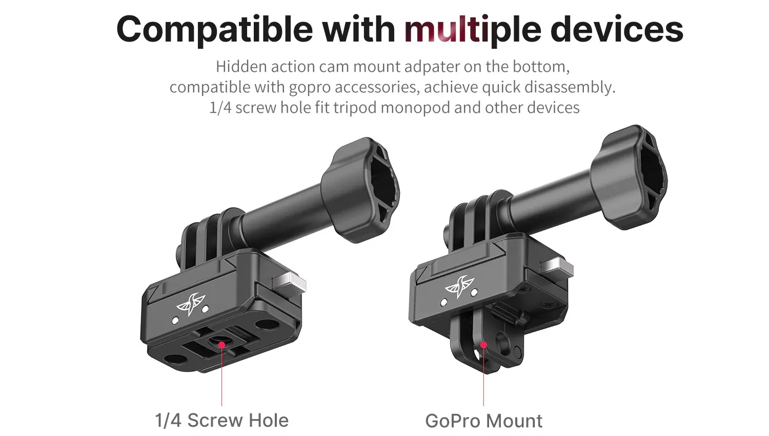 The mount includes GoPro-style mounting fingers on top and a choice in the base of either a 1/4"-20 thread for mounting to 1/4" mounts such as tripods, OR fold out the magnetic Fingers to mount to a wide range of GoPro-style mounts.