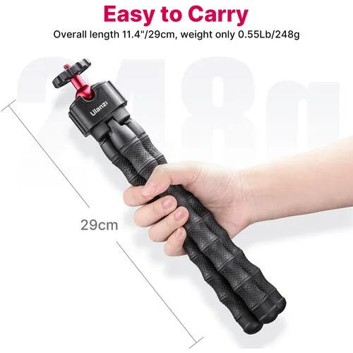 Designed for mobile shooters, live-streamers, vloggers, and more, the Ulanzi Smartphone Filmmaking Kit 2 includes a flexible tripod, phone mount, and a fill light. The tripod is made from high-elasticity rubber, an anti-slip surface, and spherical joints. The spherical joints can be wrapped around less traditional surfaces, such as bicycle handlebars or a tree branch, for a more unique shot perspective. Or keep the legs in their standard position for use on a flat surface. The tripod supports up to 1kg and also features a 360° ball head with a 1/4"-20 thread and two integrated cold shoe mounts, allowing users to attach a microphone, light, or other compatible accessory to their rig.