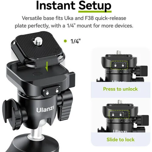 The Quick Release Tripod plate is compatible with Uka and F38 mounts. A Slide Lock keeps the plate locked off securely.