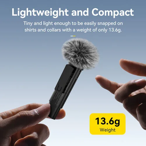 The microphone weighs only 10g and features a durable clip, so it can clip onto a label, strap, or shirt without adding much weight.