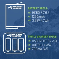 Wasabi Power Battery (2-Pack) and Triple USB Charger for GoPro GoPro HERO8 Black / HERO7 Black / GoPro HERO6 / GoPro HERO5 Black / GoPro HERO 2018 - 1220mAh batteries